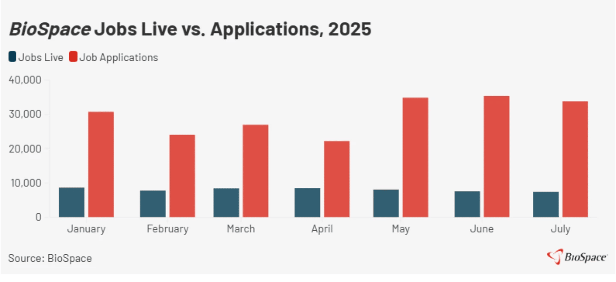 This data comes from BioSpace, “Looking at BioSpace data specifically, in July there were about 7,400 jobs live on the website and nearly 34,000 applications for those positions - the third-largest gap between these measures in 2025. In addition, last month’s applications jumped 243% year over year.” Please note that this represents data from one online platform only. Each company will likely receive additional applications through other sources as well.