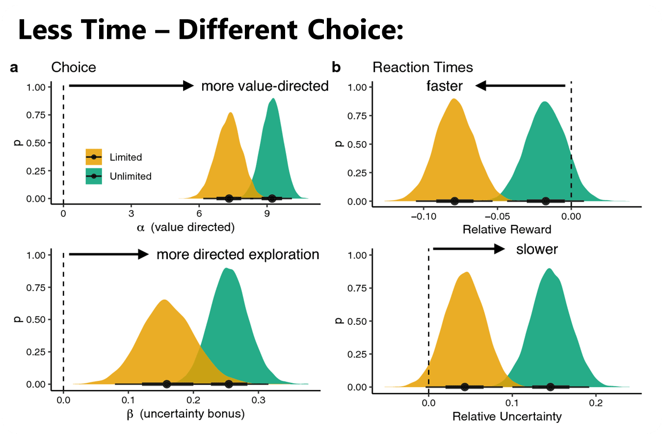Wu et al. investigated how participants react under time pressure. Without going too deep into detail, when participants had limited time they made more random choices (less value directed, lower alpha) and reduced their level of uncertainty-directed exploration (lower beta). In essence, we are not the same when we are under time pressure – this means it is sometimes as much about how you write as about what you write. read the paper here.