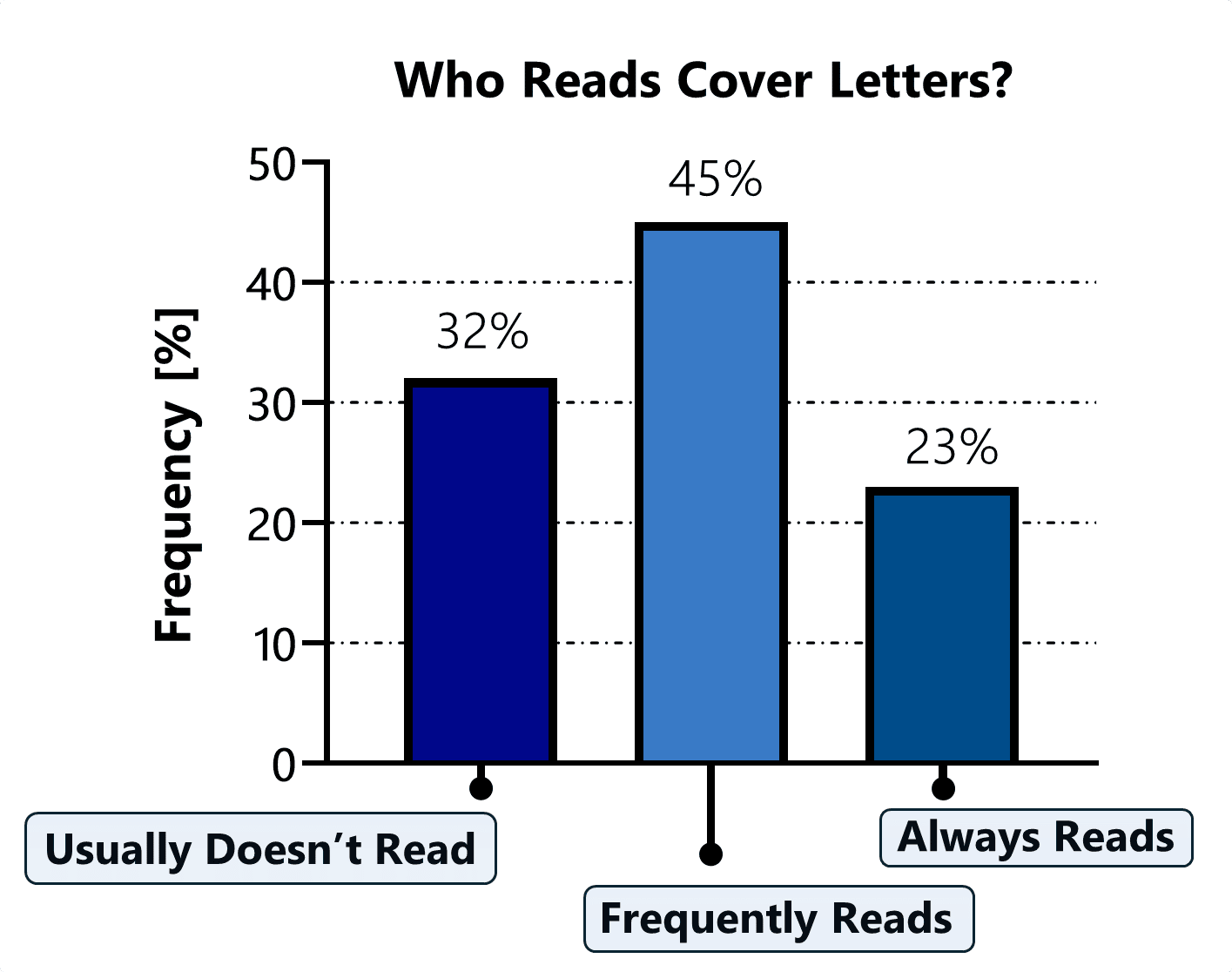 Not everybody reads cover letters but those who do consider them important. This is somewhat of an average of the numbers I could find. While the results from different survey providers vary, seniority/position (e.g., Recruiter vs Hiring Manager) introduce another factor to be considered. Therefore, although they should give somewhat of an idea, take them with a big grain of salt.